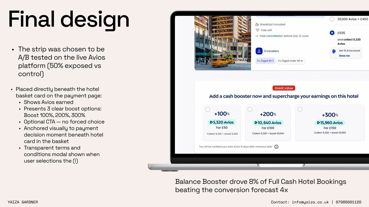 I also designed clear UX solutions for API-driven inventory, complex pricing solutions from partners such as Expedia, Avis and Viator, designing for commercial optimisation and growth.
